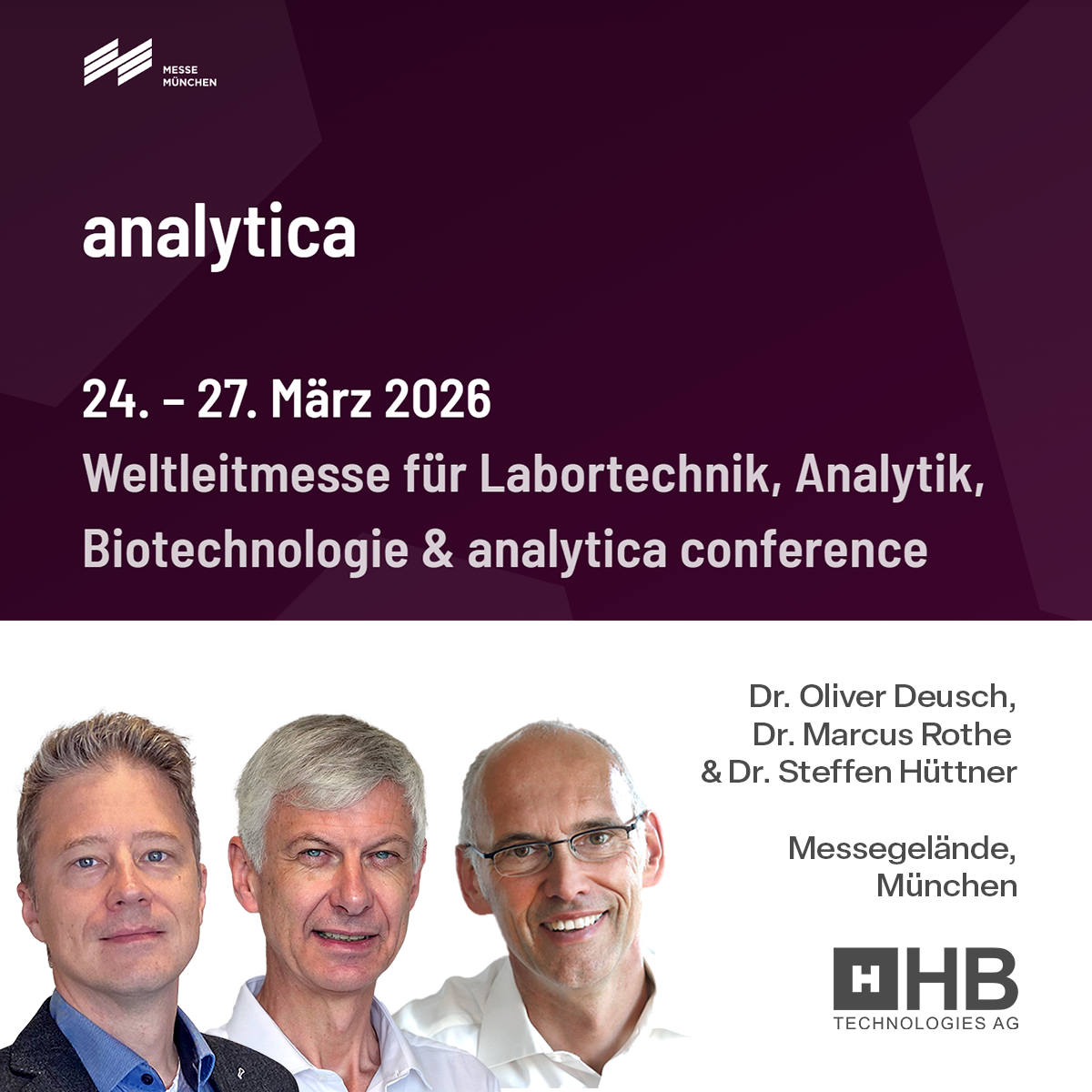 Treffen Sie Dr. Steffen Hüttner, Gründer und CEO, Dr. Oliver Deusch, Chief Business Development Officer, und Dr. Marcus Rothe, Bereichsleitung Laborgeräte, auf der analytica in München! Wir freuen uns auf den Austausch!