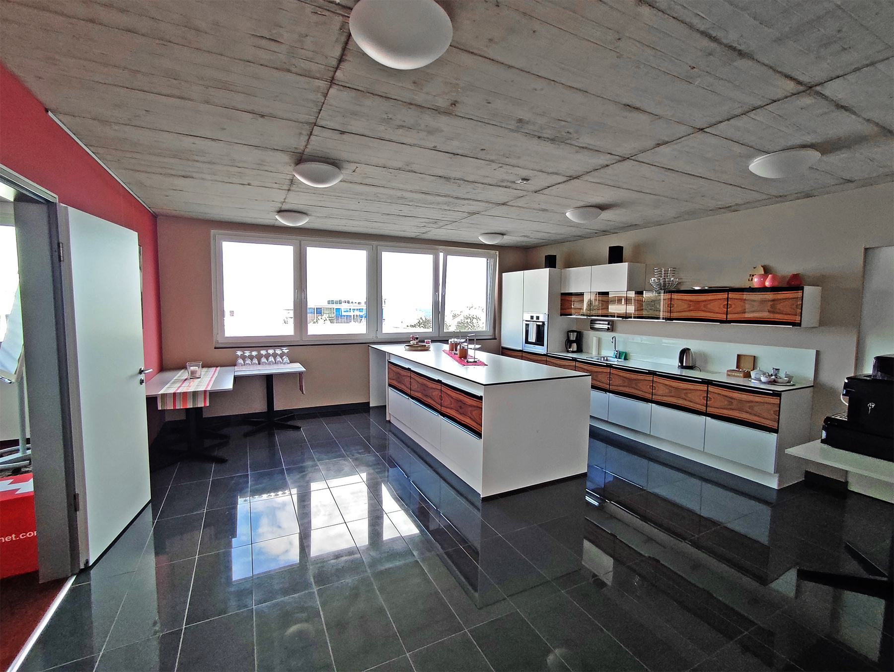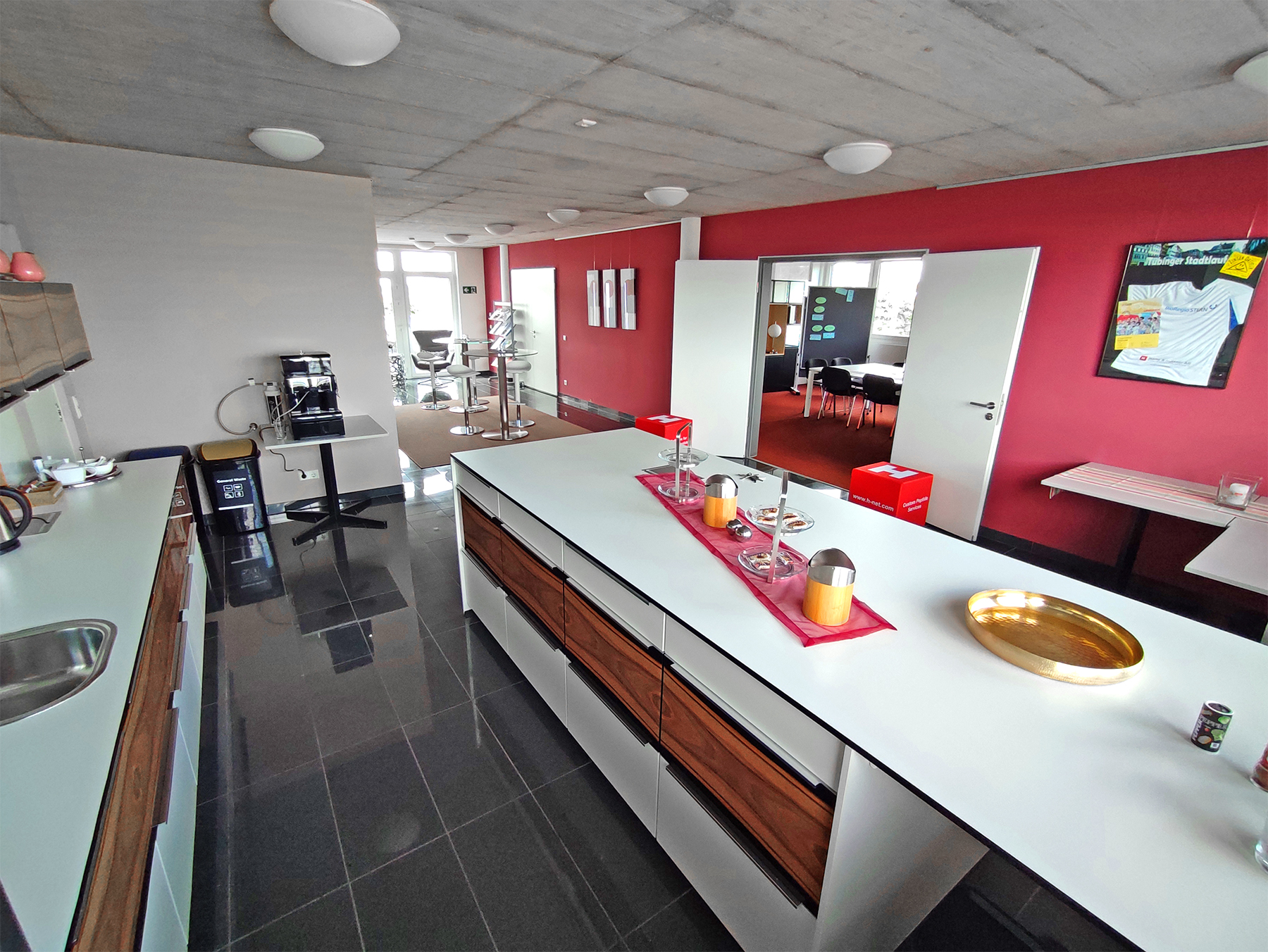 - 63 m² Küche, Foyer und Eingang. Genug Platz für Pausen, Breakoutund Netzwerk-Sessions etc.